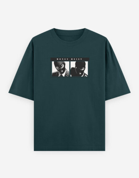 The STYQ Money Heist Oversized T-Shirt – 100% super combed cotton (240 GSM), bio-washed & pre-shrunk, Lycra ribbed neck, unisex oversized fit. Available in Black, Navy Blue, Grey Melange, Maroon, and Petrol Blue.