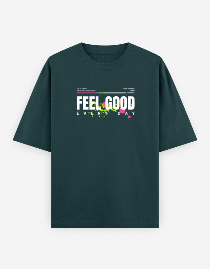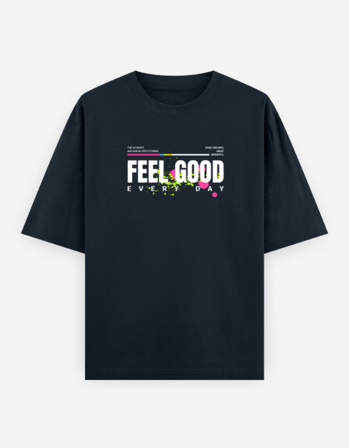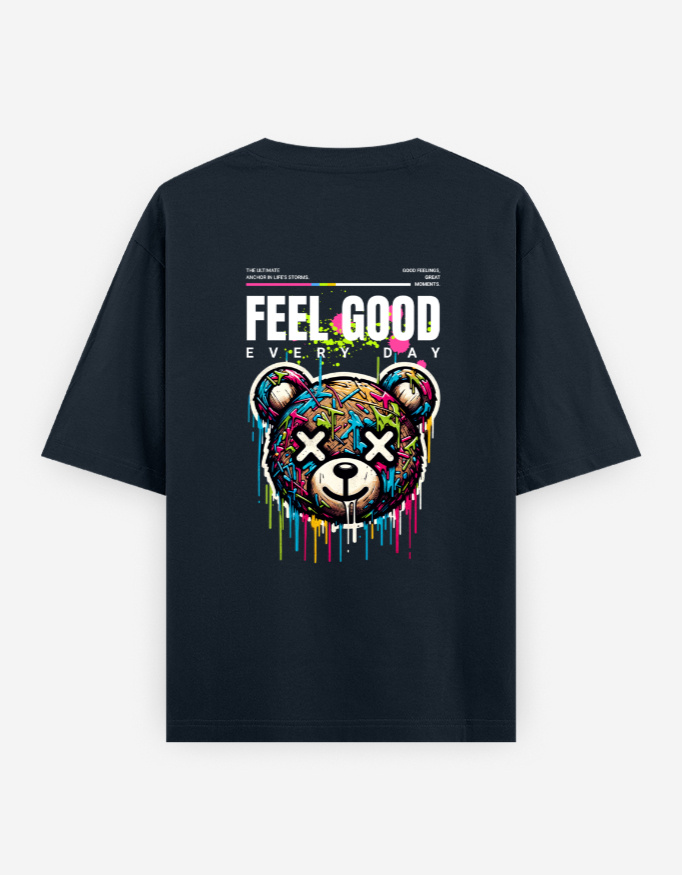 The STYQ Oversized T-Shirt – Feel Good Teddy Design Print features a relaxed unisex oversized fit in soft 100% super combed cotton (240 GSM) with bio-washed, pre-shrunk fabric and Lycra ribbed neck. Available in Black, Navy Blue, and Petrol Blue.