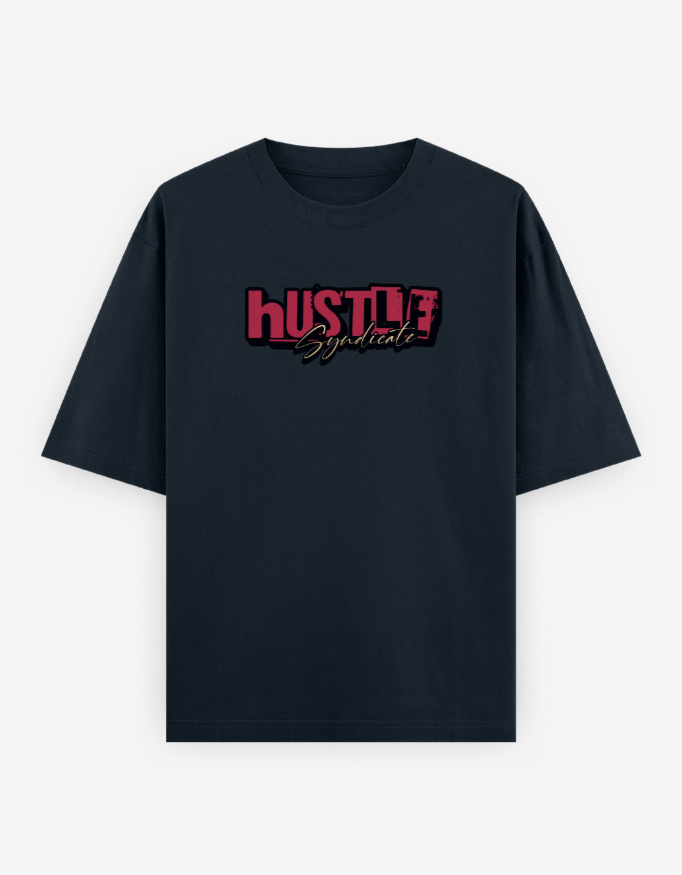 The STYQ Hustle Syndicate Oversized T-Shirt – 100% super combed cotton (240 GSM), bio-washed, pre-shrunk, with Lycra ribbed neck and unisex oversized fit. Available in Black, Navy Blue, and Petrol Blue.