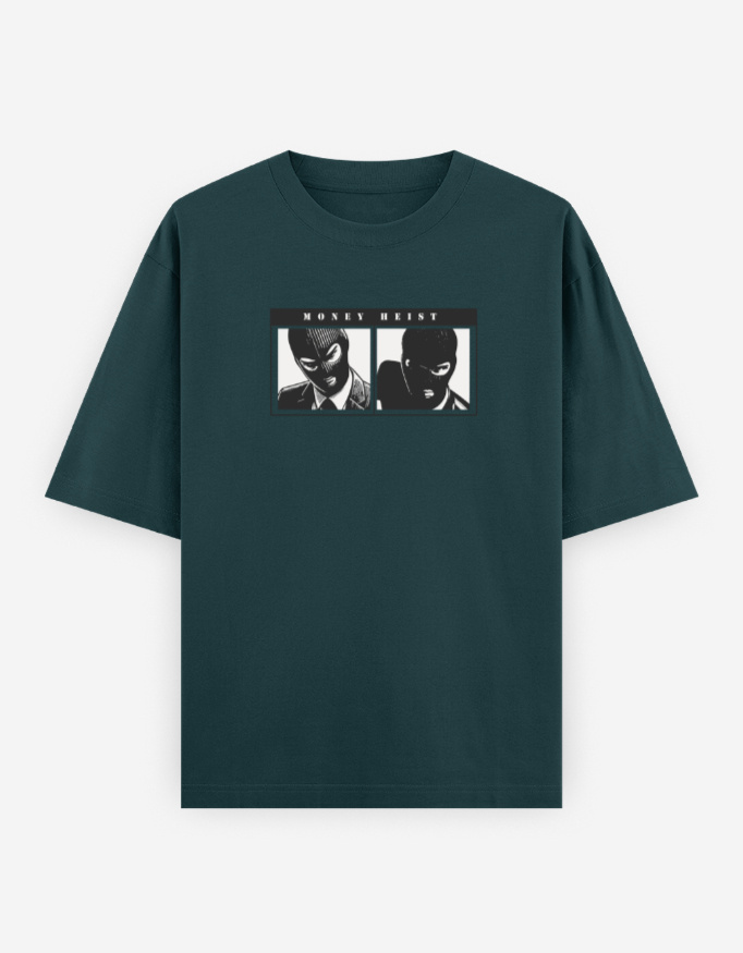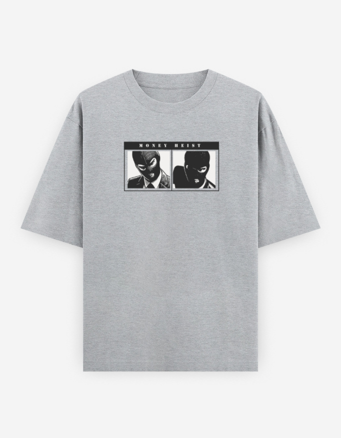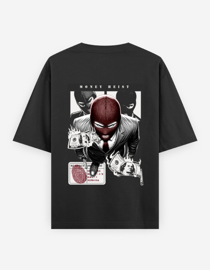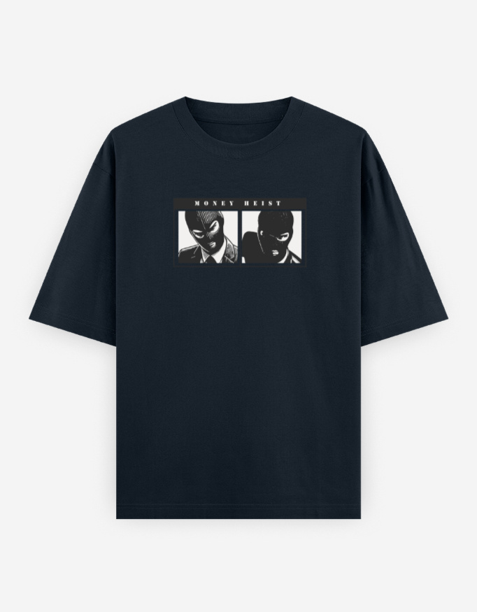 The STYQ Money Heist Oversized T-Shirt – 100% super combed cotton (240 GSM), bio-washed & pre-shrunk, Lycra ribbed neck, unisex oversized fit. Available in Black, Navy Blue, Grey Melange, Maroon, and Petrol Blue.