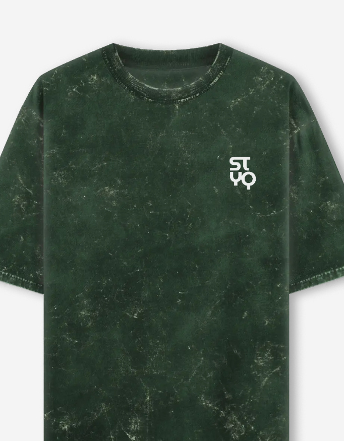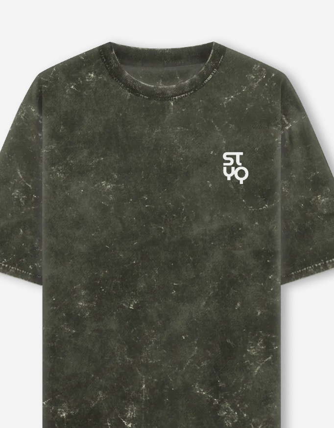 The STYQ Acid Washed Oversized T-Shirt, featuring the STYQ print, combines a unique acid wash effect with a relaxed unisex oversized fit. Made from heavyweight 100% cotton (240 GSM), available in Black, Bottle Green, Maroon, Navy Blue, and Olive Green, perfect for bold streetwear style.