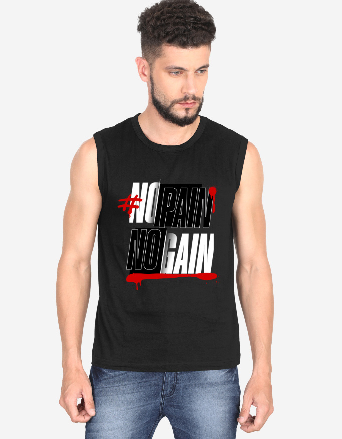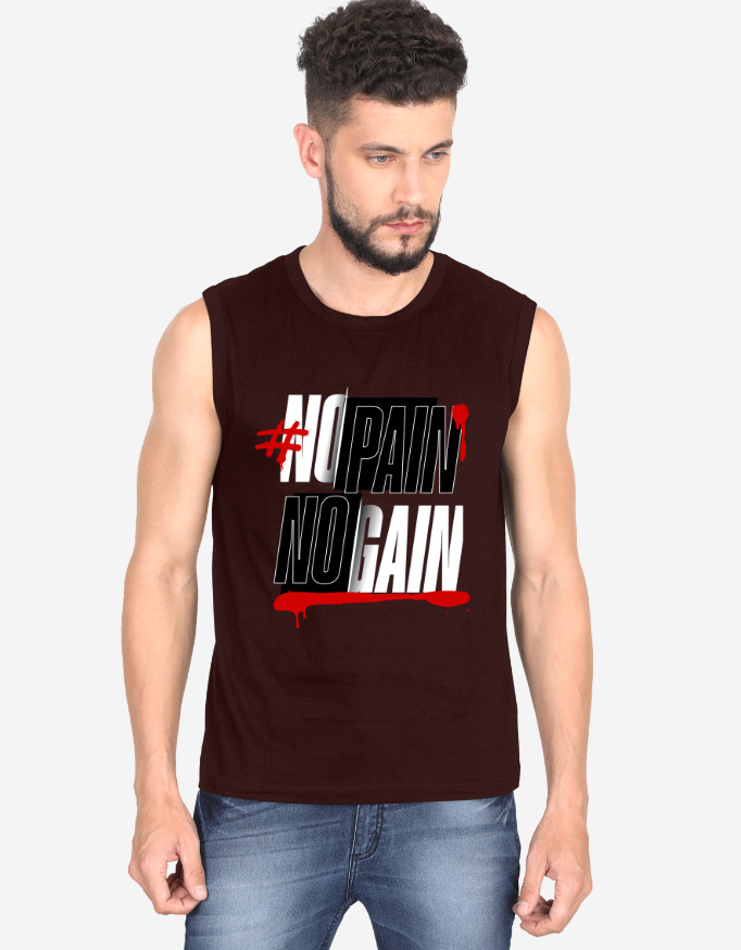 No Pain No Gain – sleeveless gym vest for peak workouts. 100% Cotton, Super Combed, Pre-Shrunk, Bio-Washed, Folded Neck, Regular Fit. Soft, breathable & durable.