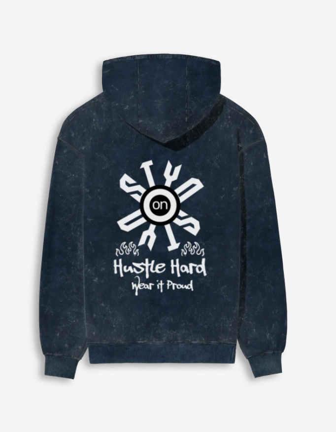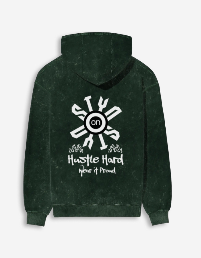The STYQ Hustle Hard Wear It Proud Unisex Acid Washed Hoodie – made from 100% super combed cotton (300 GSM) with acid-wash finish, derby ribbed hem & cuffs, and unisex regular fit. Available in Black, Bottle Green, Maroon, and Navy Blue.