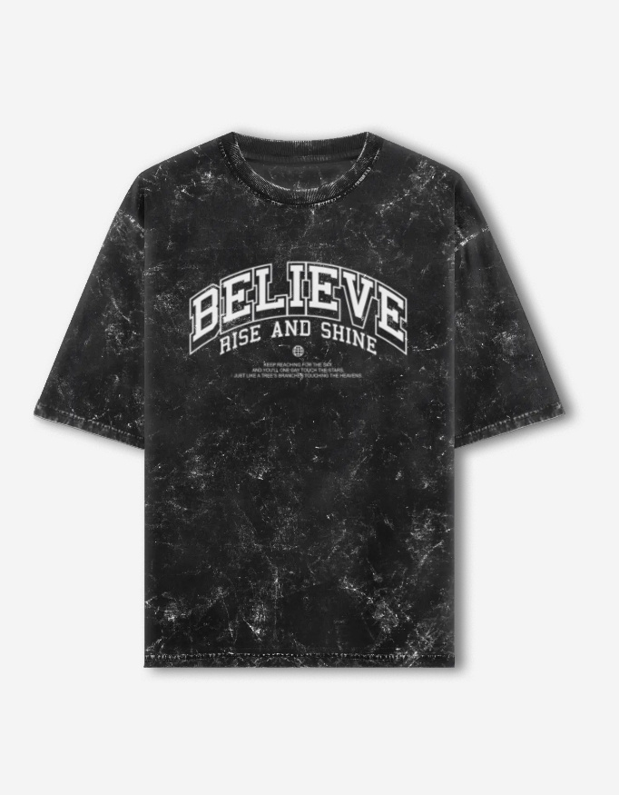 Whether layering, lounging, or making a statement, this STYQ Acid Washed Tee with Believe Rise And Shine print combines comfort, style, and motivation in one essential piece.